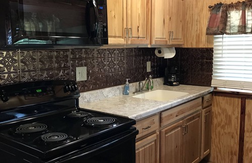 Beautiful rustic cedar cabin with large porch and within walking distance of the winery. This cabin is at the end of the road in a seclude location with a large fishing pond and plenty of nature. Each cabin has a private fire pit and charcoal grill so you can set out by the fire in the evenings and enjoy the view of the vineyard or a beautiful Oklahoma sunset. Each cabin has a kitchen and is fully equipped with everything you need and all linens are furnished.