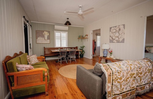 Located in Roma, Outback QLD. Step inside Herbgully Cottage and be swept away to a bygone era of vintage charm and laid-back comfort. This respectfully restored 1940’s two-bedroom cottage offers a rare, calm and quiet country escape in Outback Queensland. Original features of the cottage include the tongue and groove timber walls, hand crafted timber French doors, cast iron enamel bathtub and bathroom basin and local pine floors. You have your own small private native garden which attracts many birds, and a path leads through the garden to approximately 3 acres of west facing country to watch the sunset, have a campfire and star gaze. There is no routine, no rush, just a soft kind of presence, unfolding moment by moment. Western QLD Spirit, Outback Queensland's small batch, hand crafted spirit distillery is located next door.