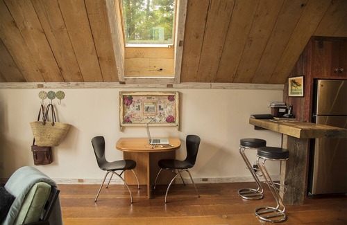 The south wall is all windows facing the deck with deck chairs and a table with two chairs for dining overlooking the surrounding towering redwiids. It’s very peaceful and sunny and is frequented by honeymooners, artists, writers and those seeking total privacy. A few books and screenplays have been written here!