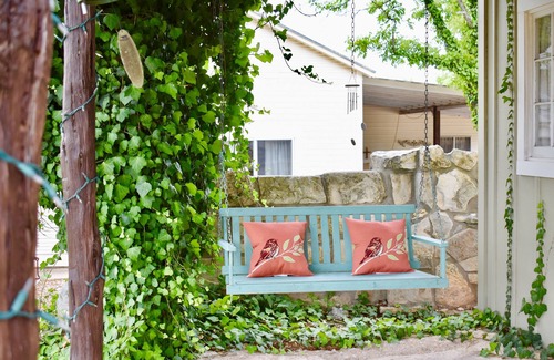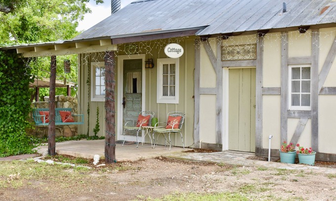 The Garden Cottage is situated beneath a large oak with lean-to porch as the perfect entrance into this quaint little cabin. This special little guesthouse is one room with high-pitched ceilings and a roomy bath. The focal point is the king-size bed. The spacious bath features a claw foot tub with shower. Enjoy your morning or evening on the porch swing perfect for enjoying a beautiful Texas evening.