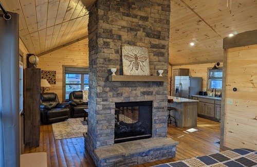 -The cabin is an open concept design with a fireplace in the center and a bed in the back with a full bathroom and kitchen.