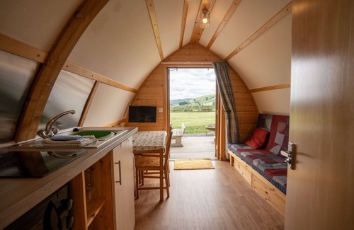 Seven en-suite glamping cabins line the edge of the pretty farm. Each one has its own outdoor private dining area with views across the countryside to the majestic mountains. Inside, the cabins are insulated and fully fitted for everything you need for a relaxing stay in the mid-Wales countryside.