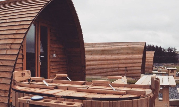 Enjoy a comfy, heated wooden cabin, complete with en suite shower & toilet, heated towel rail, and hairdryer. The cabin features a kitchenette with two hot plates, a fridge, kettle, toaster, and microwave, along with all necessary cooking utensils, pans, crockery, and cutlery. It also includes WiFi, a TV and a dining table. Outside, a private deck includes a picnic table, fire pit, and Wood-Fired Luv Tub.
