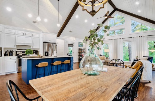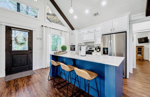 Inside, there’s a large living area with Pottery Barn designer furnishings, an open, modern kitchen and seating at the farmhouse table in the designated dining area. Just past the main area, you’ll love the bedroom (it’s a stunner), separate from the living area by a door - this is not just a one room studio. The bedroom has a King bed with luxury linens and high end memory foam mattress and French doors to the back deck/hot tub. There’s a separate door to the large, spa-like bathroom, complete with oversized tub, two person shower, his and hers fluffy spa robes, a separate toilet closet, Beekman 1802 soap, shampoo, and lotion, fluffy white spa towels, make up towels and wipes, and an eye mask for the sensitive sleeper.