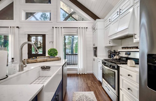 When you open the door to our professionally designed cabin, your spirit is calmed. The soothing color palette and cozy furnishings will make you want to stay indefinitely. Enjoy the diffused lighting and the backdrop of huge pines behind the cabin through the wall of windows as you enter off the covered front porch, level to the ground with no steps from the circular gravel driveway. Roads are paved all the way to the cabin, so feel free to bring your sportiest ride!