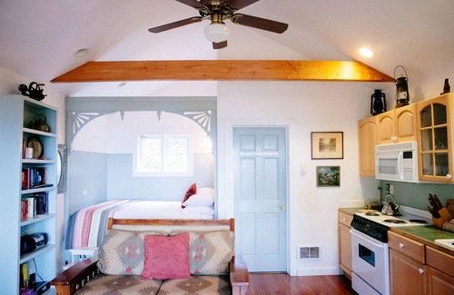 It has a covered porch, high ceilings with a ceiling fan, wood stove, hardwood floors and a Mission style oak couch with a big comfy leather chair in the corner. There is a TV, DVD, radio, and free wireless internet access onsite.