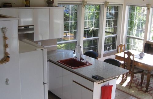Set in a lush country garden of flowers, ferns, vegetables and herbs, our cottage features tall paned windows overlooking the ocean, a cozy wood burning fireplace, gourmet kitchen and deck overlooking the sea.
