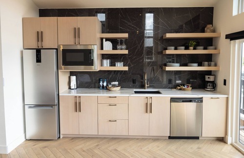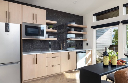 The Deckhouse cottage features expansive floor-to-ceiling windows that blend Table Rock Lake's beauty with the airy interior. Whether relaxing by the fire or enjoying your favorite shows on the 55" 4K TV with cable and full streaming options, opulence envelops you. The lavish king-sized bed ensures a restful night, and the blinds can be easily lowered at night with the touch of a remote. While the cottage is equipped with dining essentials such as a fridge, microwave, coffee maker, and dishwasher, there is no stove or oven. The spa-inspired bathroom includes a deep soaker tub for two. Step onto your private, furnished balcony and relish the invigorating mountain breeze while gazing upon the limitless horizon where Table Rock Lake harmoniously meets the sky.