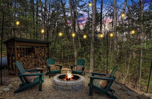 Fire Pit, Grill & Outdoor Games– Spend your evenings roasting marshmallows, grilling a delicious meal and enjoying classic games in the fresh mountain air including cornhole, life-size Jenga and connect 4. The outdoor spaces are beautifully illuminated with string lights, creating a cozy and magical ambiance after sunset.