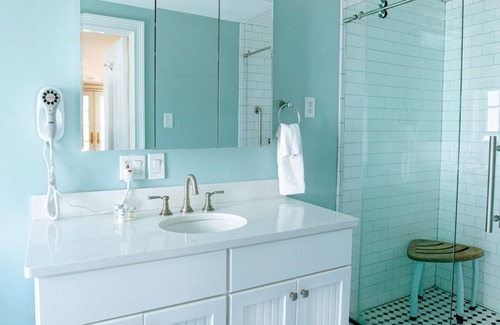 The renovated bathroom offers a luxurious walk-in shower with a daisy rain showerhead, creating a spa-like experience after a day exploring downtown Provincetown, beaches, or the vibrant art scene just steps away.