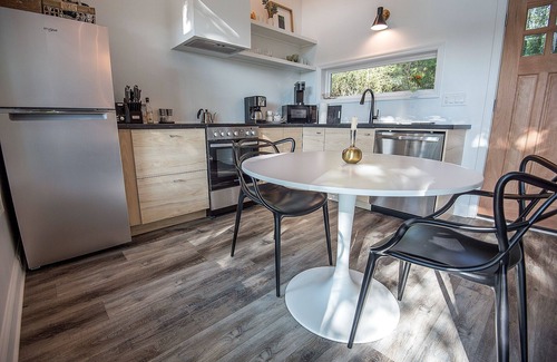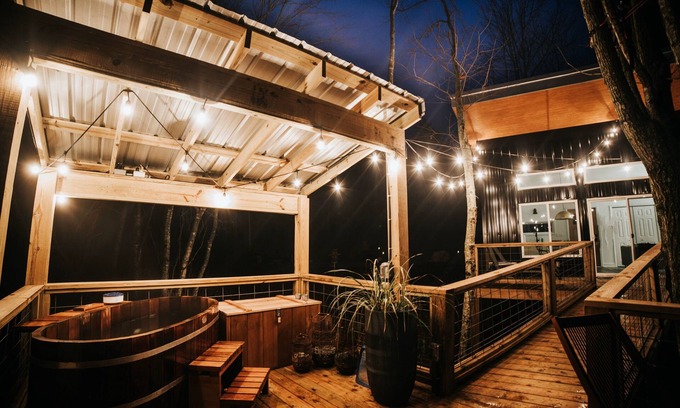 The treehouse features a light and airy open-plan living space, complete with a modern, fully equipped kitchen. The bedroom includes its own screened-in porch for relaxation and enjoying the breathtaking views. The beautifully decorated bathroom offers a full-size shower and bathrobes for added comfort. On the rear deck, guests will find a gas BBQ, seating, and sun loungers. The calming Japanese Ofuro soaking tub, situated in a separate relaxation area among the trees, is highly appreciated by our guests. This heated cedar tub, which does not have jets, provides a beautifully calming experience, perfect for cleansing the mind and soul in natural surroundings. The tin roof covering this area enhances the experience during rain or snow.