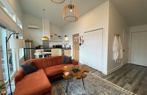 Pamoons' interior and exterior have been designed exclusively for adults. Our home lacks child safety locks on external and internal doors, and the soaking tub area is not gated. The Japanese soaking tub provides a heated, calming experience without jets and is emptied and sanitized after each guest's departure, remaining open year-round.