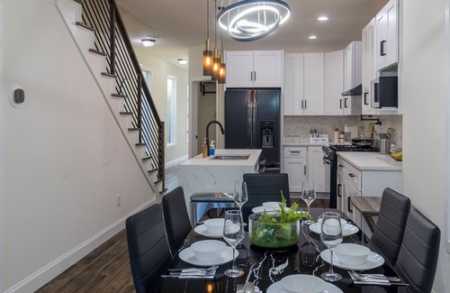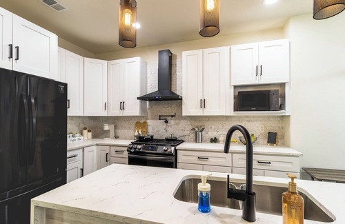 Welcome to our bold 3-story Dallas townhome just 10 min from downtown! Enjoy jungle-themed walls, 3 bedrooms (4 beds), and a rooftop lounge with a blow-up movie setup—perfect for unforgettable nights. Relax in the soaking tub, cook in the fully stocked kitchen, and unwind in the chic living space. Close to Deep Ellum, Bishop Arts & more. Great for girls' trips, families, or weekend escapes. Book now for style, comfort & rooftop vibes!