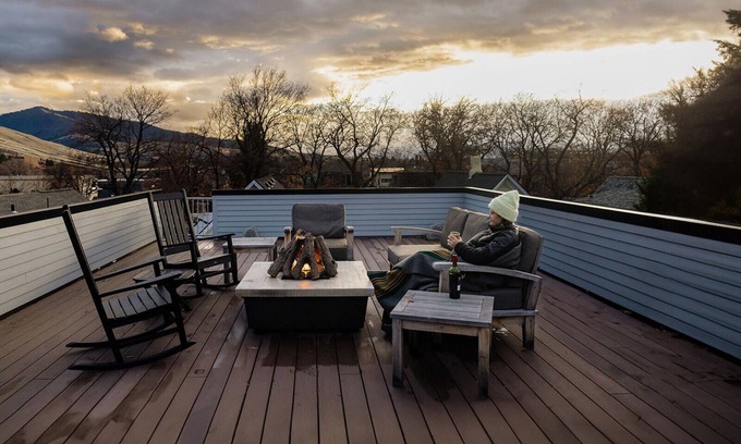 Spectacular roof-top deck with outdoor living space, barbeque, fire pit and view! Also has beautiful salt water hot tub and fire pit on spacious ground level patio. 5 min. walk to charming downtown stores, restaurants and coffee shops! Just across the Clark Fork River from U of M and biking/walking trail along the river. Easy access for fishing, biking, hiking and skiing.