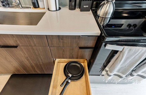 The modern and comfy getaway will leave you in awe with its carefully picked amenity. Stylish wooden floors extend throughout the entire apartment.