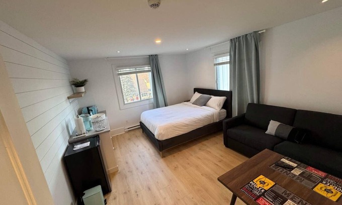Awesome shared terrace with BBQ on the 4th floor , 1 bedroom room. 1 queen bed plus,1 sofa bed , 1 full bathroom, mini fridge, microwave. Walking distance to restaurants and shops downtown Bromont. 3-4 minutes driving distance to the ski hill and aquatic park. 5 minutes driving distance to Centre équestre de Bromont. 15 minutes driving distance to Granby zoo. There is 2 hot tubs available all year from 9:00 to 22:00 and a heated salted pool from June 1st to September 15th.