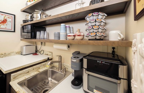 One of the things guests love most about our room is the kitchenette. With a mini-fridge, microwave, sink, and coffee maker, you'll have everything you need to make quick meals or enjoy a cup of coffee in the morning. The room is also equipped with a small table and two chairs, making it easy to enjoy your meals or catch up on work.