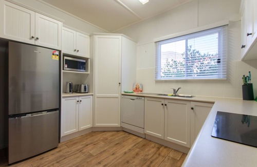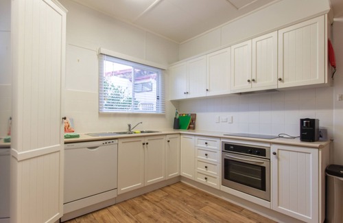 A new great size kitchen with induction cook top, oven, dishwasher, pod coffee machine, pantry cupboard and breakfast bench. The kitchen is fully stocked with cutlery, crockery, cooking and entertaining needs.