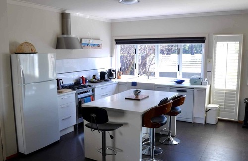 With a separate games room. With a pool table, family room, dining area, as well as a fully equipped kitchen and laundry, there is room to spare. There are three bathrooms. The house has 6 split airconditioners, a natural gas heater. We want this to be a home away from home, so there are , books, boardgames, CDs, DVDs, Records and Record Player. There are many small items supplied which make holiday life easier - detergent, coffee, tea, clingwrap, aluminium foil, tissues.......and more. The double garage carport . There is a gas BBQ .