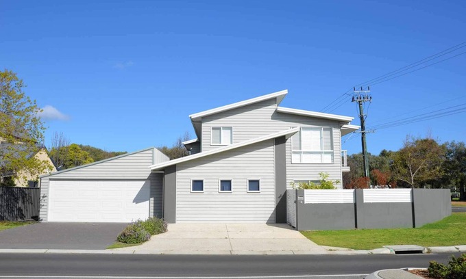 This new 5 bedroom, 3 bathroom house is purpose built for holidays and is ideal for families. It is in a peaceful location, across the road from large park with children's play equipment. There are frequently ibis from the nearby wetlands and groups of pink & grey galahs foraging in the park. The beach is 200 m away.