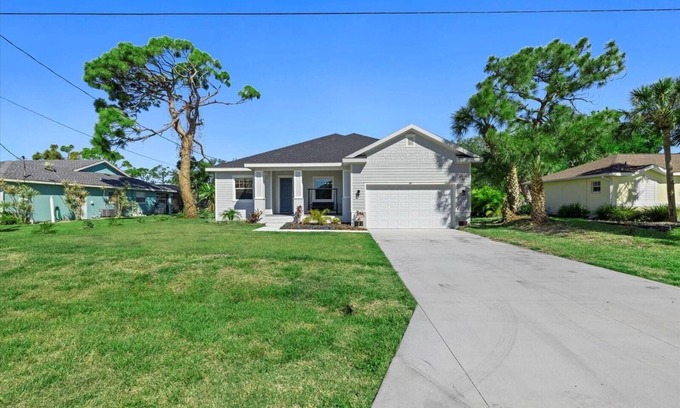 Enjoy this beautiful new build 4 bedroom 3 bath 2 Car garage home. Bright & airy open floor plan. Split bedrooms. This home has king size beds in all the rooms except 1 and that has a bunk bed. Smart TVs , ceiling fans and a fully functioning kitchen. Inside laundry room with a washer & dryer. A hot tub on the back screened lanai and a fenced in yard should you decided to bring your 4 legged family member. Golfing, dining, shopping and beaches are just a short drive away.