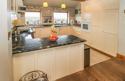 Amenities: Electric underfloor heating with woodburning stove. AGA, electric oven, fridge, freezer, dishwasher, washing machine, tumble dryer, 2 x TV and WiFi. Fuel and power inc. in rent. Bed linen and towels inc. in rent. 3 travel cots (please bring own cot bedding) and 3 highchairs, 1 baby bouncer also available on request. Ample off-road parking. Front terrace garden with table and chairs, as well as rear garden with large lawn areas, two patios areas with seating, barbeque hut and sheltered hot tub. Two well behaved pets welcome. Shower seat and zimmer frame are available on request. Two dog crates on request (500cm height by 500cm width by 800cm depth), dog bowls and dog beds in various sizes provided. EV charger available, charges apply. Sorry, no smoking allowed. Shop 1.2 miles, pub 0.6 miles. Please note this property cannot accept check-ins on a Sunday or bookings that depart on a Saturday