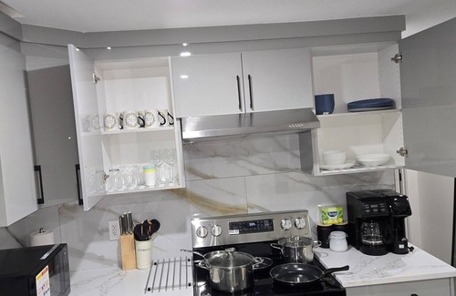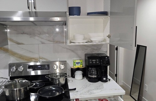 ★ A stylish open concept, well equipped full kitchen with new modern stainless steel appliances such as a microwave, fridge, electric stove and dishwasher along with glasses, mugs, dishes and cutlery, with a gorgeously decorated dining space to give you and your family/business partners memorable experience