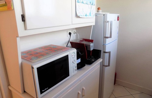 This apartment is composed of a living room with a sofa bed in 160cm, a fully equipped kitchen (vitro hob, oven, microwave, coffee maker DOLCE GUSTO, toaster, kettle, fridge with freezer part, dishwasher...