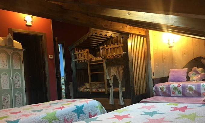 double with bathroom, 1 and single bed with bathroom. BUHARDILLA PLANT: 1 Habit. marriage with bathroom and 2-seater daybed and bathroom with classic bathtub, 1 room. 7 seats, a bathroom. (* extra beds *) Personalized rooms with different decorations, BATHROOM IN ALL ROOMS. Thermostatically self-regulating heating. Firewood without limitations for Fireplace and Barbecue. Top quality utensils. 2 SMART TV 50 ". Blue-ray player Netflix, movies and series streaming on smartTV. Diversity of board games latest editions: Trivial, Party, Monopoly, Bingo, etc. Table football, game table, blackboard, paintings, books and much more.
