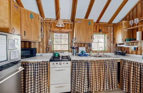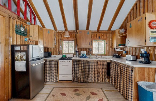 Inside, the cabin is equipped with all the essentials for a comfortable stay, including a wood stove for those chilly evenings, a fully stocked kitchen, and cozy sleeping arrangements featuring a queen bed, double bed, and twin bed. Enjoy your morning coffee on the deck while soaking in the serene surroundings, or gather around the dining area for a family meal after a day of exploration.