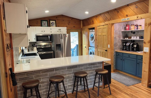 Inside, the cabin blends classic woodsy charm with thoughtful updates. The living room features warm wood paneling, a wood-burning fireplace, and a comfy queen pull-out sofa. The 2022-renovated kitchen offers quartz countertops, stainless appliances, and a dedicated coffee bar — ideal for mornings in.