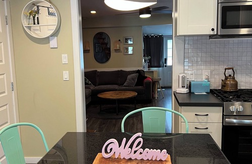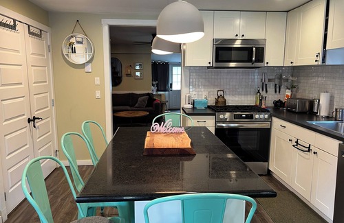 ---- Kitchen has everything you need to cook, eat, and drink with. There is an island with 5 stools, and a small table with 4 chairs near the front door. Full fridge with ice maker in the freezer. We do not provide left over containers, however plastic wrap is provided.