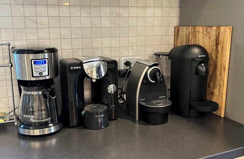 ---- 4 Coffee Machines: Drip Coffee (with reusable filter), Nespresso (both small and big pods), and Tassimo (coffee is not provided), and an electric Milk Frother.