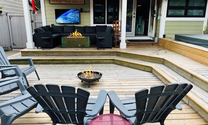 Great family escape just a few seconds walk to the lake. Older Quaint 1200sqft cabin. Hot Tub, Large backyard/patio area, outdoor natural gas fire table, natural gas fire pit, and Indoor natural gas fireplace for those cold nights. A quick 4 minute walk to the water slides, adventure park and restaurants. Hiking trails are just a short drive away. Parking for 4 small vehicles (3 if there is a larger vehicle)