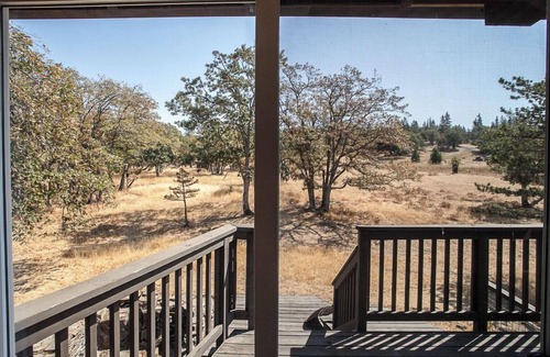This is a rustic rural multi-level home set on five acres of oak woodland with a grassy meadow and peekaboo views of Mt. Adams and Mt. Hood. It offers 1/2 mile of mowed walking paths through the woodland with reflectors on trees for evening strolls. Its small pond attracts an array of wildlife: birds, turkeys, and deer.