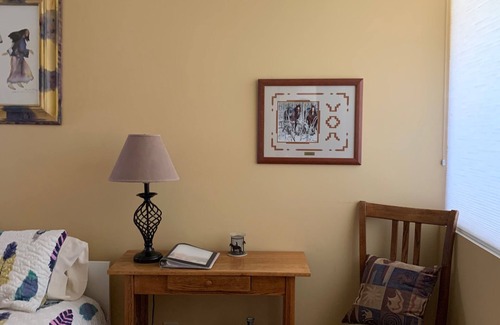 The Poolside room is at the far end of the house and is the only guest room with direct access to the pool area. There are outside doors on both side of the room giving it a very airy feeling. There is a covered patio outside the room and a flower garden. The room is decorated with southwest colors and themes. The bathroom has lots of light. The floors are hardwood.