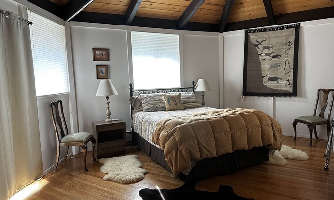 This is a two bedroom two bath house on a large ranch with a vineyard, winery and thoroughbred racehorses and lots of areas to explore. The RustRidge House overlooks the vineyard and is close to the county road but backs up to the forest. The approach is a paved uphill driveway. There is an outdoor staircase that leads to the entrance. The dining area, living area and kitchen are an open floor plan with lots of windows, high ceiling and hardwood floors. The kitchen is fully equipped. The dining room table is also a comfortable work space. The wraparound living room has two couches and a wall mounted TV. The bedrooms are decorated with a Southwest and Native American theme. The bathrooms have earth tones and tile floors. There is a wrap around deck with access by sliding glass doors. The space has its own wifi, streaming TV and an electric fireplace.