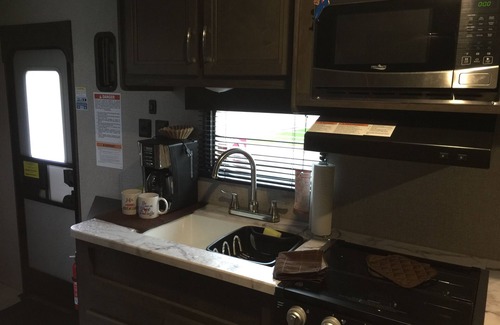 This is a brand new Jayco RV with everything you need. Located on my property, I'm there if you need anything. This is a quiet neighborhood with tons of amenities like a huge disc golf course and park. We are also down the street from Lake Kyle.