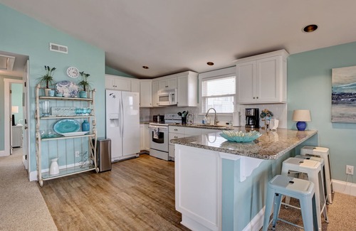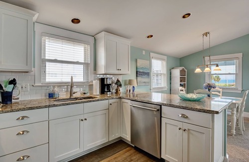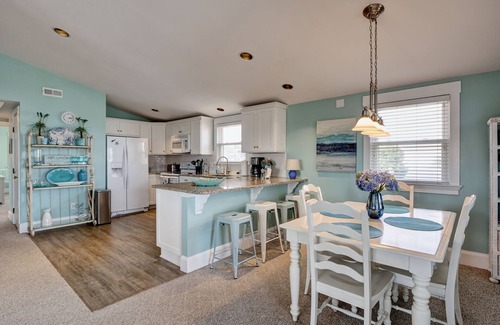 This classic cottage on the coveted South End has all the charm and all the updated amenities to make your stay perfect. Enjoy sweeping ocean views from the front windows while preparing meals on the huge granite counter in the completely renovated, fully stocked, kitchen. Vaulted ceilings and a bright, open plan make family sharing time and entertaining a joy.