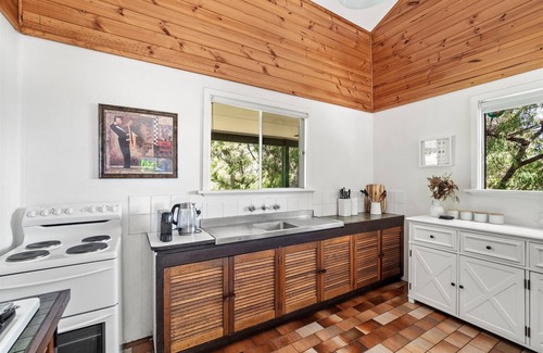 The simple country-style kitchen is well-equipped with a gas cooktop, electric oven, coffee machine, sink, and a fridge/freezer, making it easy to prepare meals and snacks.