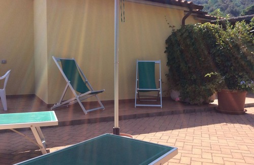 The apartment includes a terrace overlooking the sea and an area equipped with sun loungers, deck chairs, umbrella and table with chairs to eat outside.