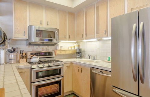 Adjacent to the living, dining, and kitchen areas are the two bedrooms. Each bedroom offers a king bed, loads of sunshine, and ample closet space. The master bedroom has an en-suite bathroom with a shower and a 37-inch flat-screen TV with cable. The 2nd bedroom has an en-suite bathroom with a shower/bathtub and a 32-inch smart TV with cable. The library/den off the entryway hallway features high ceilings and a large collection of books, with a big desk should you need to do any work while here. The leather sofa is a queen sofa sleeper; should you need extra accommodations while here. There is a gas insert fireplace to relax by. French doors lead out to the back patio. A bathroom adjacent to the den offers a shower for additional guests. The large back patio has 2 tables with seating for 8 and is adjacent to the back yard with a lawn and garden area.