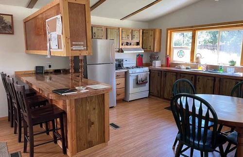The house is in a secluded setting, but close to the few amenities our little town of Story has to offer. The house is bright with natural light and while is isn't large it is quite comfortable with a sit in kitchen as well as a breakfast bar. The house itself is equipped with just about anything you would need, so if your planning on a little bit longer stay, know that you won't need to bring a lot of extras.