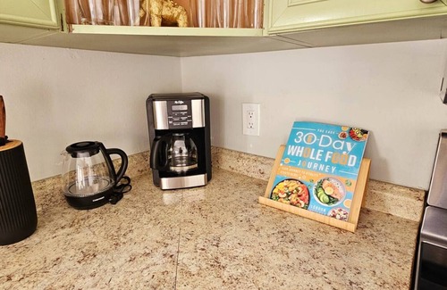 Kitchen with coffee maker, blender, toaster, oven & essentials.