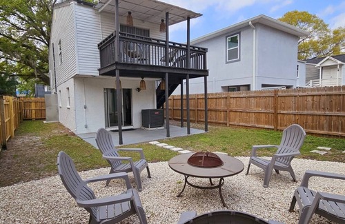 Private fenced backyard with fire table, BBQ grill, outdoor seating & family games.