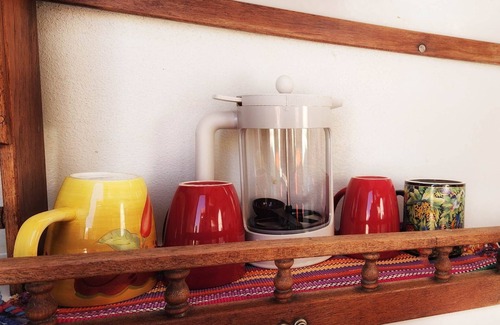 This floating home features a full-size bed in the v-berth, triangle-shaped. The dining table converts into a single bed in a few simple steps. Two-burner alcohol stove, with utensils, a pot, and frying pan, help create almost any meal. Percolator and coffee cups (grab some coffe from the Co-op) turn this into a glamorous Vashon Island camping experience.