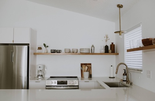 The Villas are designed for short stays, long weekends or for a unique styled location for brands to shoot their products. The space features warm tones, natural finishes and local art for an effortless vibe that allows visitors to relax the second they walk in the door. Complete with two bedrooms, two bathrooms and a backyard complete with tropical landscaping, lounge area, dining and outdoor shower. One of 4 Villas located in St. Augustine Beach. Not pet friendly. 10 minutes to Historic Downtown!