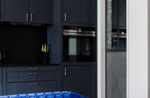 This living space is full of character and unique features – from flagstone floors, original beams lining the ceiling above, a delicate, modernist chandelier and eye-catching electric blue sofa, in velvet. The kitchen is open plan from the seating area and is fitted in chic, dark cabinets. It comes complete with all the amenities you will need during your stay.