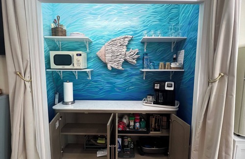 Included are a mini-fridge, microwave, electric skillet, coffee maker and coffee bean grinder, wifi, and television with HBO Max and Hulu. We have a play kitchen for children and games for everyone.