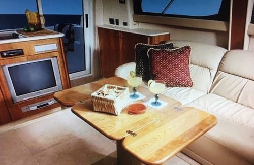 Relax and enjoy life on the water. Cozy and comfortable interior with large surrounding windows offers full vista views and a feeling of space. This boat has 2 bedrooms, each with double beds. There’s a bathroom with a full sized shower along with seating. The salon includes, a well equipped kitchen with lots of space for food prep with the BBQ located right outside the door. Spacious and comfortable dining area with an extendable table and; a full living area complete with tv and reclining leather seating.